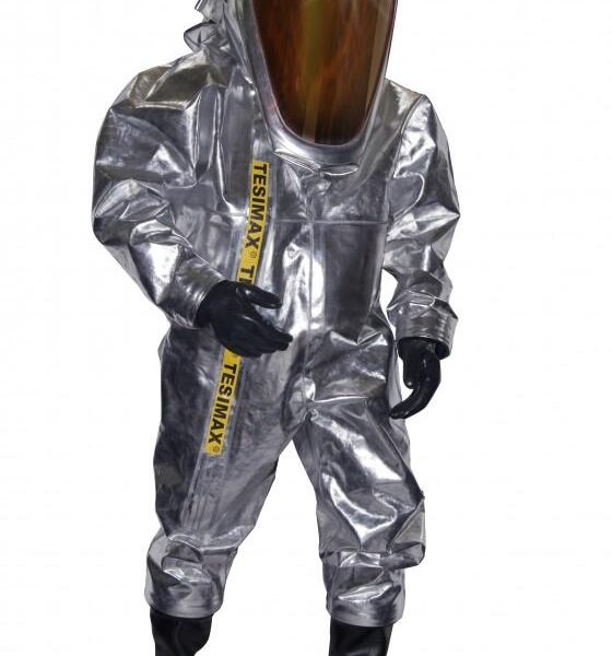 لباس آلومینیومی Tesimax مدل HS 10 با حفاظت حرارتی بالا، ماسک پیشرفته و محافظ کفش Kevlar، گزینهای ایمن و حرفهای برای آتشنشانان و عملیات حرارت شدید است.
